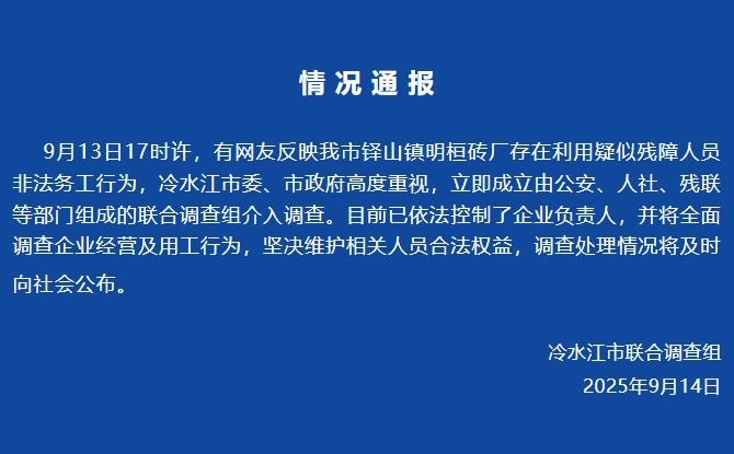 據(jù)“冷水江新聞”微信公眾號(hào)消息,9月13日17時(shí)許,有網(wǎng)友反映湖南冷水江市鐸山鎮(zhèn)明桓磚廠存在利用疑似殘障人員非法務(wù)工行為,冷水江市委、市政府高度重視,立即成立由公安、人社、殘聯(lián)等部門組成的聯(lián)合調(diào)查組介入調(diào)查。目前已依法控制了企業(yè)負(fù)責(zé)人,并將全面調(diào)查企業(yè)經(jīng)營(yíng)及用工行為,堅(jiān)決維護(hù)相關(guān)人員合法權(quán)益,調(diào)查處理情況將及時(shí)向社會(huì)公布。