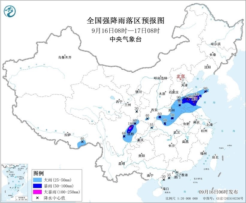 預計,9月16日8時至17日8時,四川盆地中西部、甘肅南部、河南中東部、山東中南部以及蘇皖北部等地部分地區(qū)有大到暴雨,其中,山東中南部、四川盆地北部等地部分地區(qū)有大暴雨(100~180毫米)。上述部分地區(qū)伴有短時強降水(最大小時降雨量20~50毫米,局地可超過70毫米),局地有雷暴大風等強對流天氣。