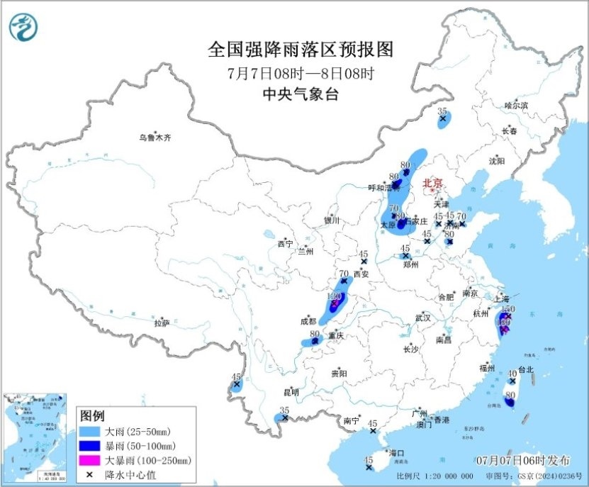 預(yù)計,7月7日08時至8日08時,浙江東部、內(nèi)蒙古中部、山西中北部、河北西北部和西南部、山東北部、河南西北部、陜西西南部、四川東部、云南西南部、臺灣島等地部分地區(qū)有大到暴雨,其中,浙江東部、四川東部等地部分地區(qū)有大暴雨(100~180毫米)。上述部分地區(qū)伴有短時強降水(最大小時降雨量20~50毫米,局地可超過70毫米),局地有雷暴大風(fēng)等強對流天氣。中央氣象臺7月7日06時繼續(xù)發(fā)布暴雨藍色預(yù)警。