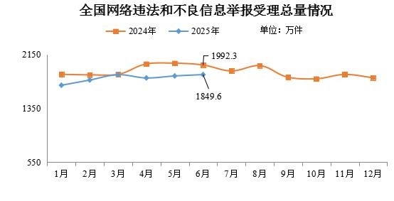 2025年6月全國受理網(wǎng)絡(luò)違法和不良信息舉報(bào)1849.6萬件