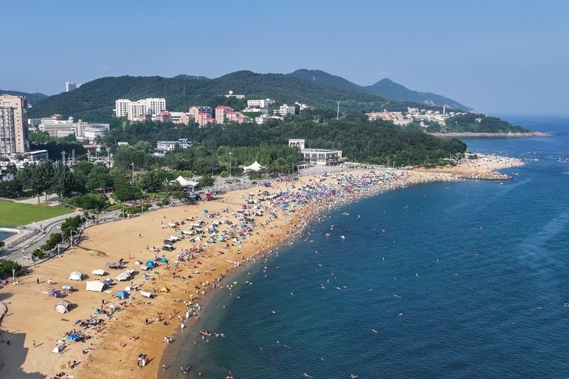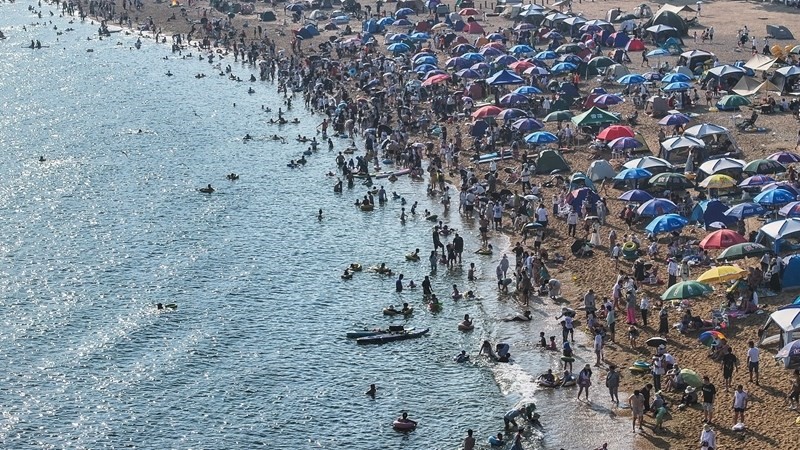 近日,遼寧省大連市持續(xù)高溫天氣,大連傅家莊公園海濱沙灘迎來(lái)大量游客,人們?cè)诤I沙灘戲水消暑。