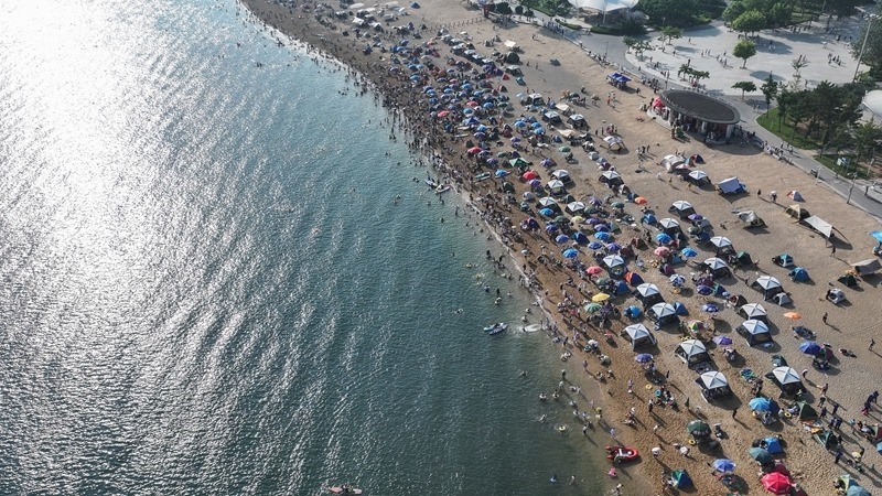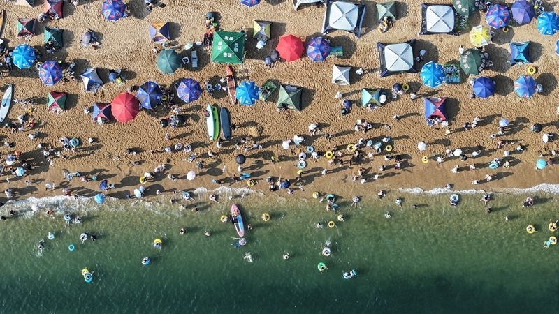 7月10日,游客在大連傅家莊公園海濱沙灘戲水消暑(無(wú)人機(jī)照片)。
