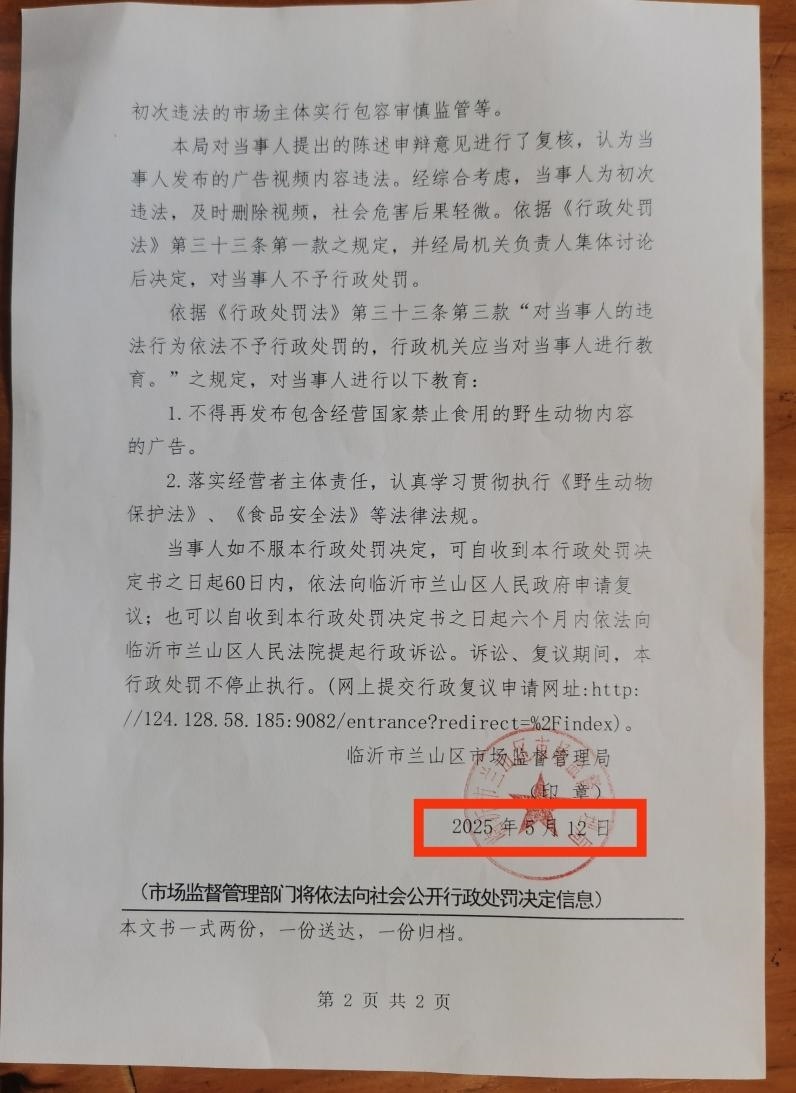 7月14日,山東臨沂“拍蛤蟆湯視頻被罰45萬(wàn)元”事件迎來(lái)最新進(jìn)展。代理此案的律師龔華告訴津云新聞?dòng)浾?,涉事飯館收到當(dāng)?shù)厥袌?chǎng)監(jiān)管局送達(dá)的《不予行政處罰決定書》,但落款時(shí)間卻為5月12日,其認(rèn)為本次送達(dá)的程序不合規(guī)。