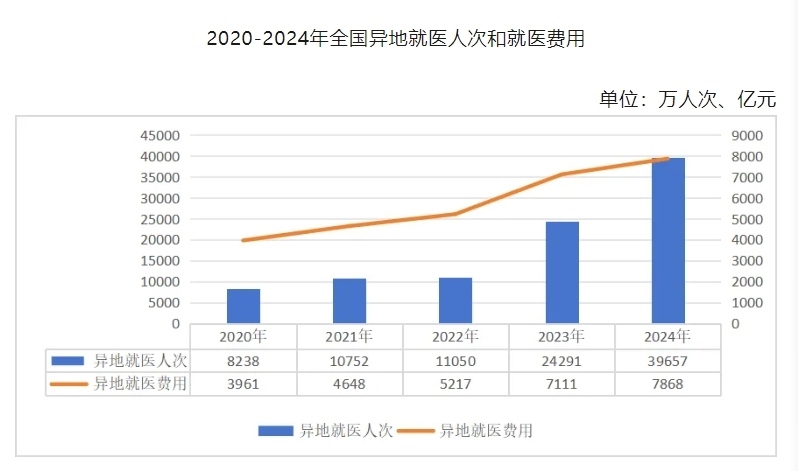 數(shù)據(jù)顯示,2020年至2024年間,全國異地就醫(yī)人次和就醫(yī)費用呈增長態(tài)勢。