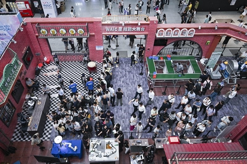 這是7月29日拍攝的“WAIC里技能大舞臺”,多款機(jī)器人在此進(jìn)行技能展示。