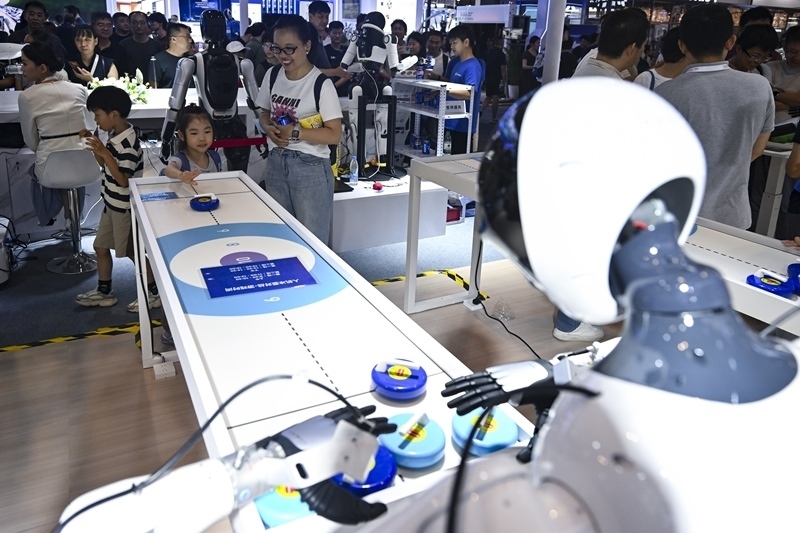 7月29日,小朋友在和一款機(jī)器人玩冰壺游戲。