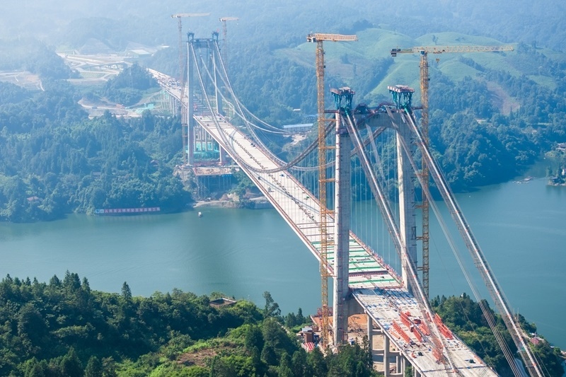 這是8月3日在懷化市沅陵縣拍攝的施工中的張官高速洞庭溪沅水特大橋(無人機(jī)照片)。