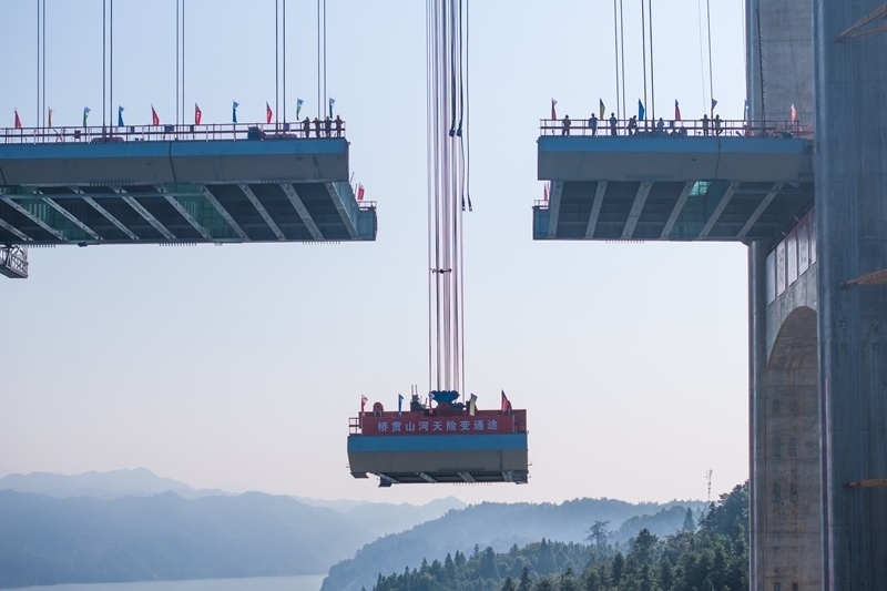 8月3日,在張官高速洞庭溪沅水特大橋施工現(xiàn)場,一塊鋼混結(jié)合梁在被緩緩提升(無人機(jī)照片)。