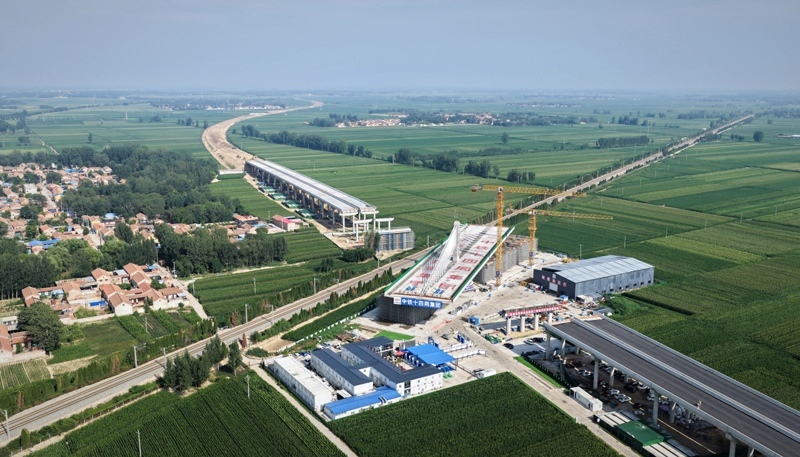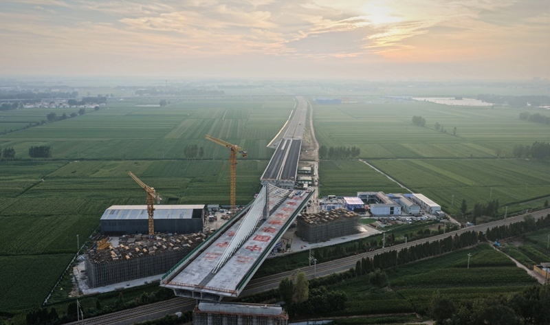 當(dāng)日,在山東德州,由中國鐵建投資集團(tuán)投資建設(shè)、中鐵十四局集團(tuán)承建的德州至上饒高速公路(簡稱“德上高速”)臨清連接線跨京九鐵路斜拉橋?qū)崿F(xiàn)精準(zhǔn)轉(zhuǎn)體對(duì)接。該橋采用不對(duì)稱矮塔斜拉結(jié)構(gòu),重達(dá)23500噸。