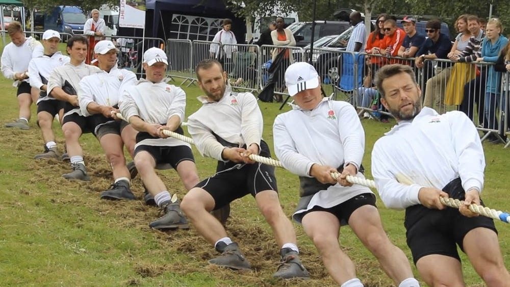 與人們平??吹降摹坝驳匕魏印辈煌肋\會上的拔河比賽是在室外天然草皮上進行,也就是“草地拔河”。比賽實行8人制,像拳擊一樣分不同的重量級,全隊體重一旦“超重”,直接少一人上場。比賽使用的專業(yè)麻繩長達35米,周長12.5厘米,繩上中心點拉過己方4米標記線即為獲勝。