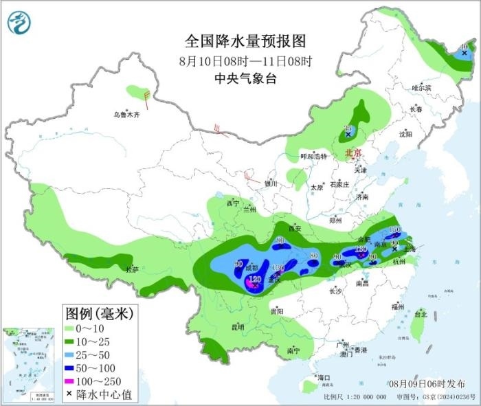 8月10日08時至11日08時,陜西南部、河南南部、四川大部、重慶大部、湖北大部、安徽中南部、江蘇中南部、上海、浙江北部以及內(nèi)蒙古東南部、黑龍江東北部等地部分地區(qū)有中到大雨,其中,安徽西南部、江蘇中南部、湖北東部和西南部、四川盆地中東部和西南部、重慶中西部和東北部、云南東北部等地部分地區(qū)有暴雨或大暴雨(100~150毫米)。內(nèi)蒙古西北部、新疆沿天山地區(qū)等地部分地區(qū)有4~5級風(fēng)。東海北部海域?qū)⒂?~7級風(fēng)、陣風(fēng)8級,黃海南部海域、東海南部海域?qū)⒂?~6級風(fēng)、陣風(fēng)7級。