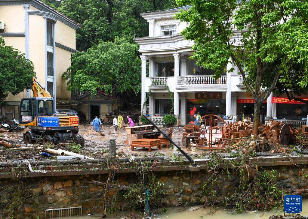 8月6日,在廣東清遠(yuǎn)佛岡縣石角鎮(zhèn)黃花村,工作人員用挖掘機將村民清理出的淤泥與雜物轉(zhuǎn)移到拖拉機上統(tǒng)一清運。