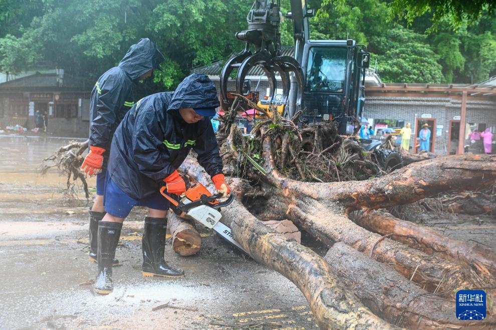 8月6日,工作人員在廣東肇慶鼎湖區(qū)鼎湖山風(fēng)景區(qū)門口用電鋸切割被沖倒的樹木。