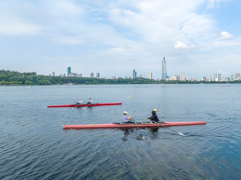 8月8日,市民在江蘇省南京市玄武湖公園劃艇(無人機(jī)照片)。