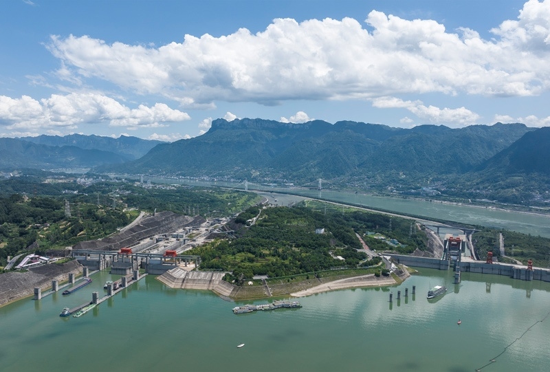 8月16日,在湖北省宜昌市,船舶有序通過三峽雙線五級船閘和三峽升船機(無人機照片)。