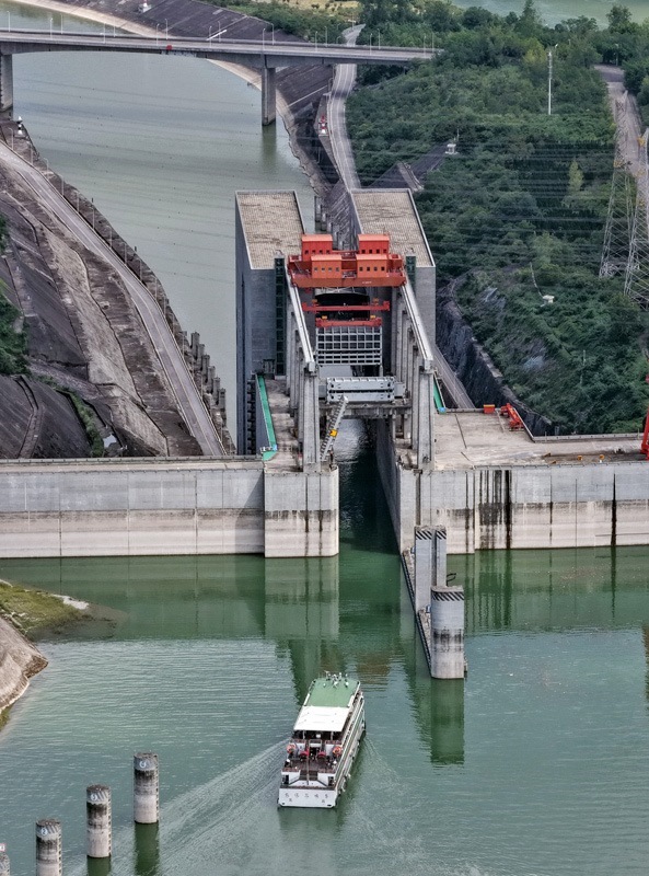 8月16日,在湖北省宜昌市,游輪滿載游客通過三峽升船機(無人機照片)。