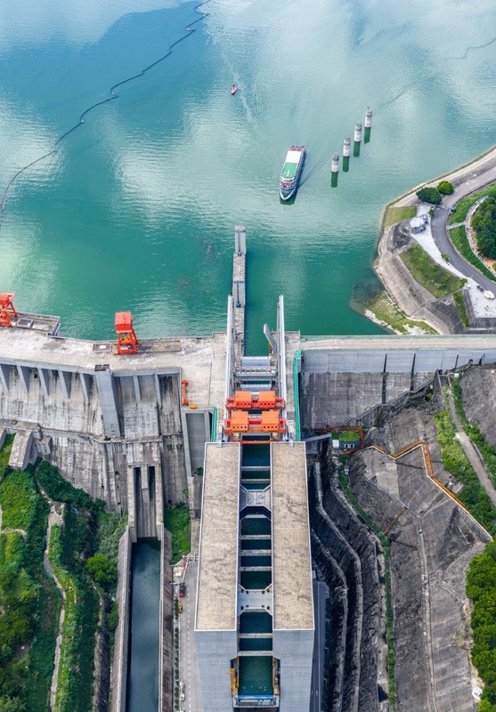 8月16日,在湖北省宜昌市,游輪長江三峽5號駛向三峽升船機(無人機照片)。
