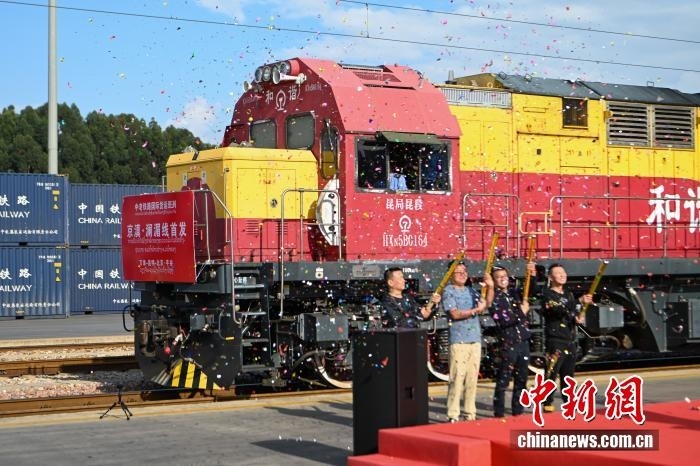 2024年10月14日,首趟滿載老撾進(jìn)口香蕉的中老鐵路“京滇 瀾湄線”國際貨運(yùn)列車從云南省昆明市王家營西站駛出,標(biāo)志著中老鐵路國際冷鏈班列暨“京滇 瀾湄線”國際貨運(yùn)列車正式開行。中新社記者 李嘉嫻 攝