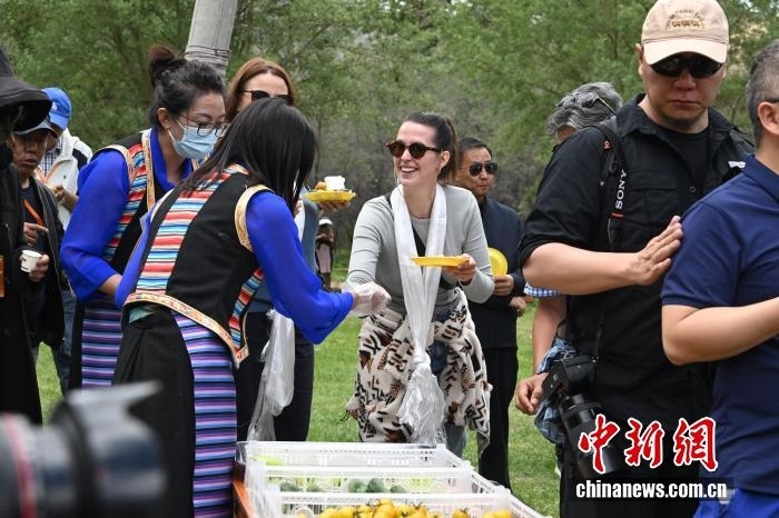 2025年6月5日,105位境外游客組成的國際旅行商考察團(tuán)走進(jìn)西藏山南市瓊結(jié)縣強(qiáng)吉村。他們參觀古建活化項(xiàng)目,觀看非遺展演,體驗(yàn)鄉(xiāng)村露營。 中新社記者 貢嘎來松 攝