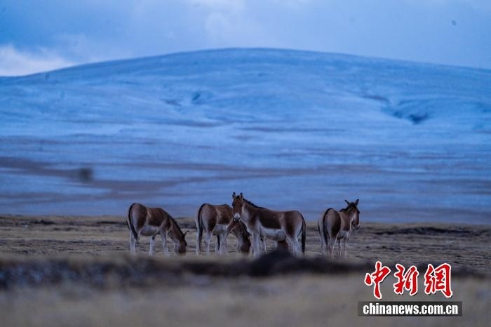 2024年10月23日,中國國家一級保護(hù)動物藏野驢在西藏自治區(qū)那曲市安多縣多瑪鄉(xiāng)境內(nèi)的草原上覓食、嬉戲。中新社記者 貢嘎來松 攝