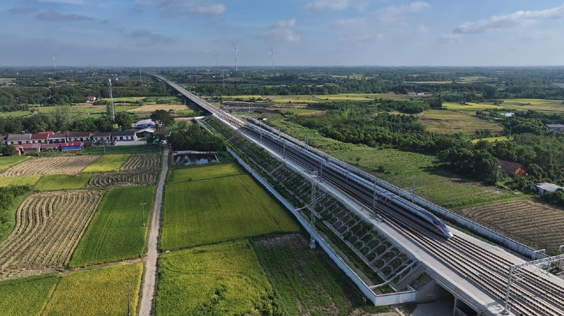 8月23日,試驗(yàn)列車(chē)從荊門(mén)市沙洋西站折返,駛向襄陽(yáng)東站(無(wú)人機(jī)照片)。