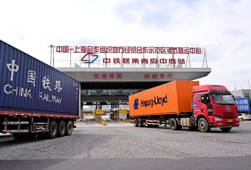 8月27日,貨運(yùn)卡車從位于上合示范區(qū)的中國-上海合作組織地方經(jīng)貿(mào)合作示范區(qū)多式聯(lián)運(yùn)中心駛出。