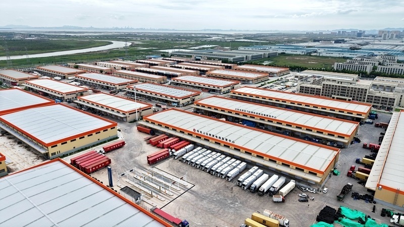 這是位于青島膠州市的中國傳化(上合)國際物流港。該物流港集智能倉儲、零擔(dān)分撥、多式聯(lián)運(yùn)等功能于一體(8月27日攝,無人機(jī)照片)。