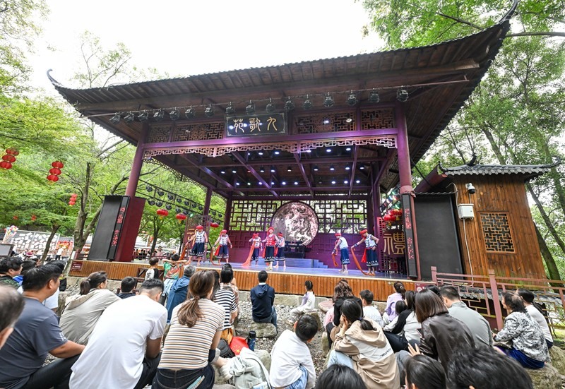 10月3日,人們?cè)诤笔∫瞬酗鰵w縣屈原故里景區(qū)觀看表演。