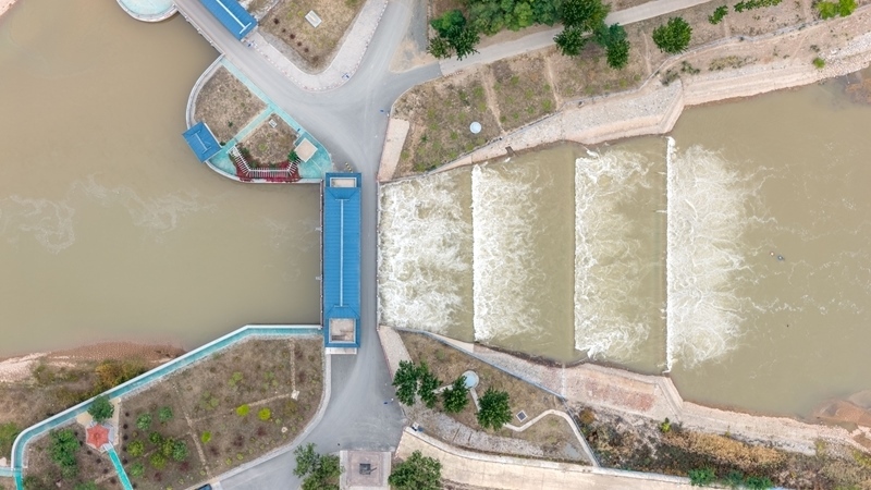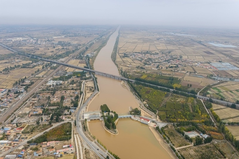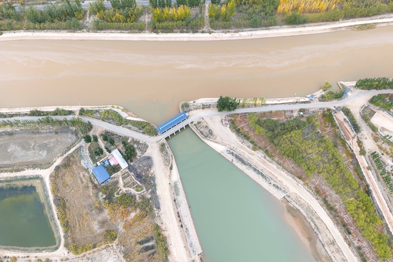 10月16日,用于灌溉的黃河水流經(jīng)內(nèi)蒙古巴彥淖爾市臨河區(qū)境內(nèi)的總干渠第二分水樞紐(無(wú)人機(jī)照片)。