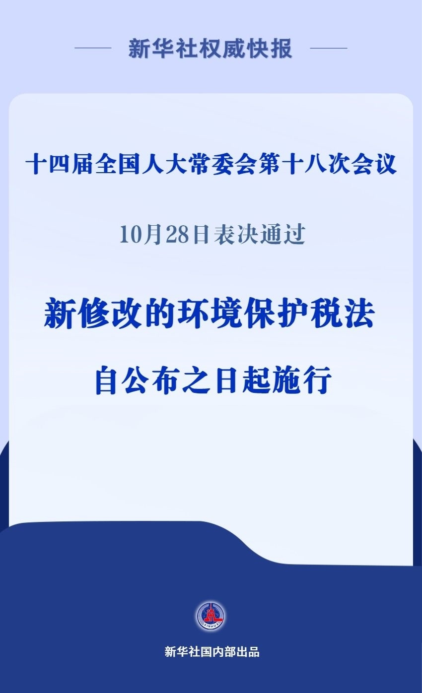 十四屆全國(guó)人大常委會(huì)第十八次會(huì)議10月28日表決通過(guò)關(guān)于修改環(huán)境保護(hù)稅法的決定,并自公布之日起施行。