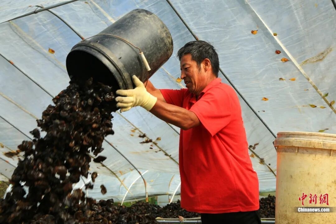 (菌農(nóng)將采摘下來的黑木耳倒出。黃松甸鎮(zhèn)供圖)