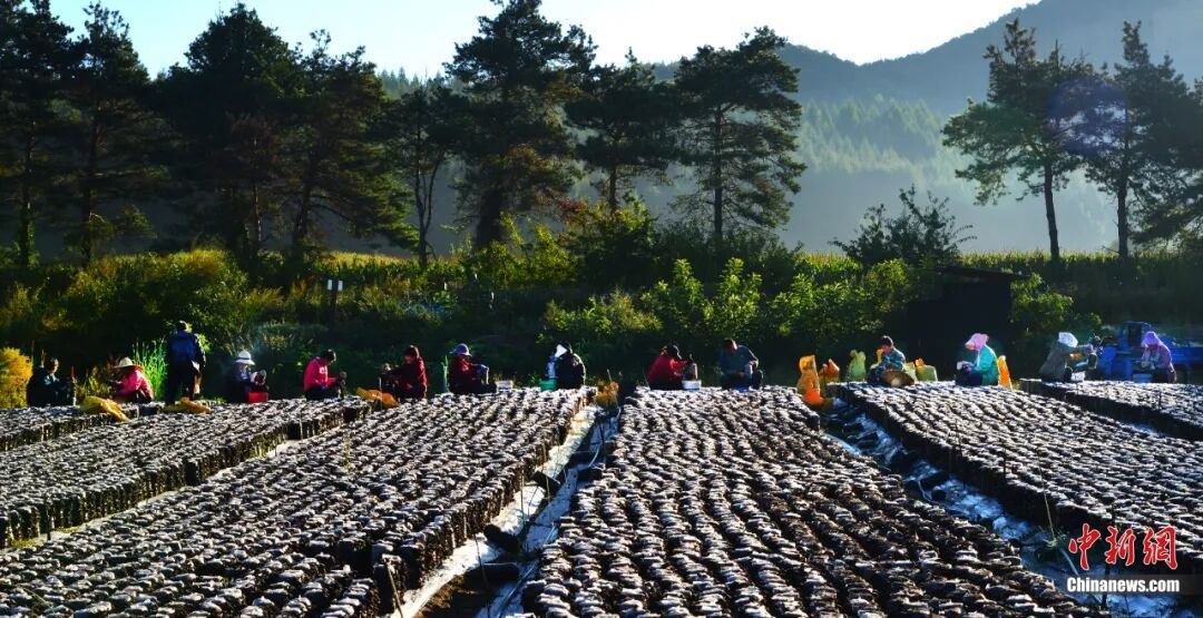 (菌農(nóng)們正在采摘。黃松甸鎮(zhèn)供圖)