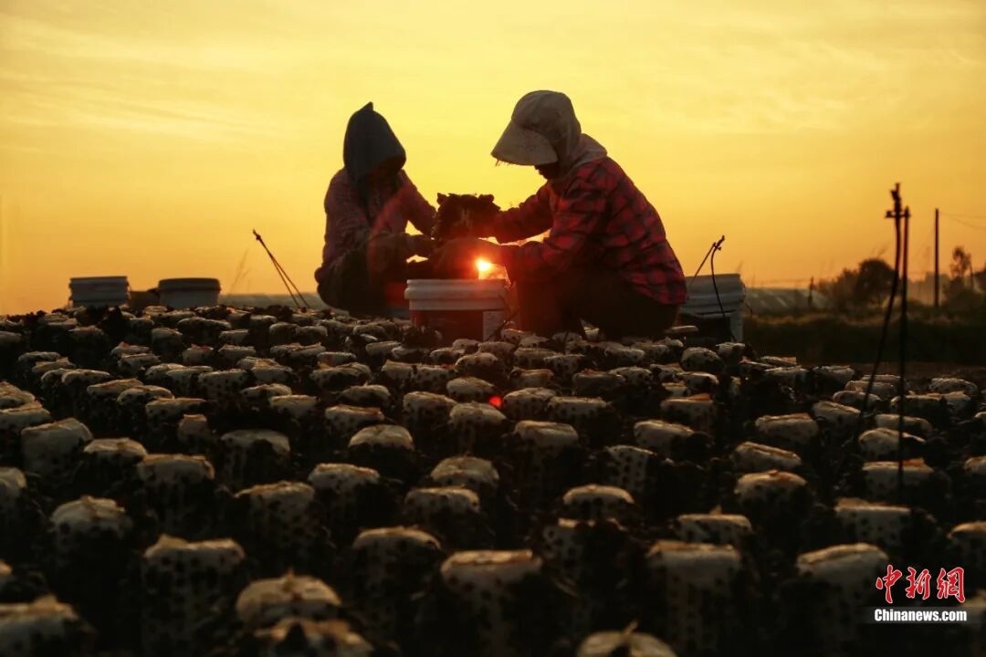 (夕陽下,菌農(nóng)們正在采摘。黃松甸鎮(zhèn)供圖)