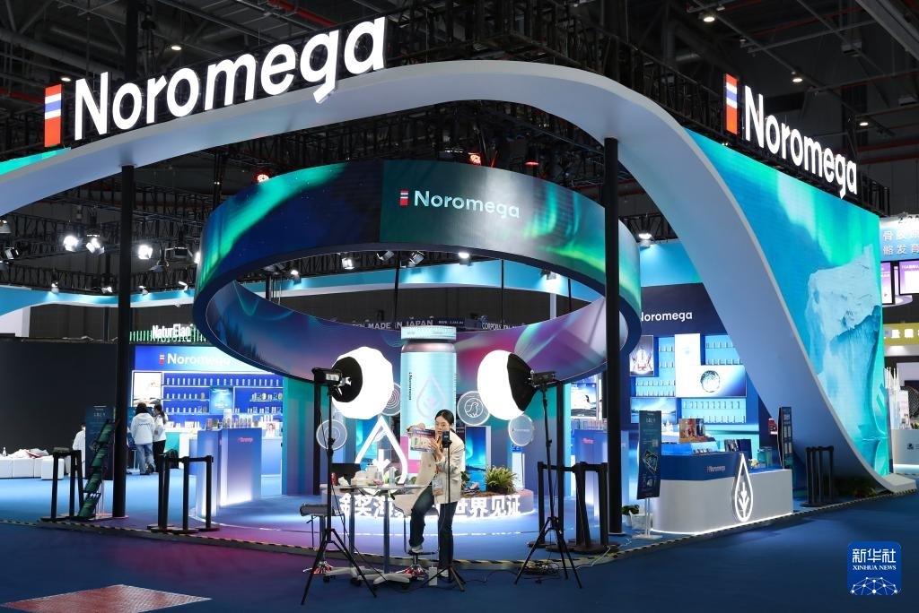 11月4日,工作人員在第八屆進(jìn)博會(huì)醫(yī)療器械及醫(yī)藥保健展區(qū)直播。