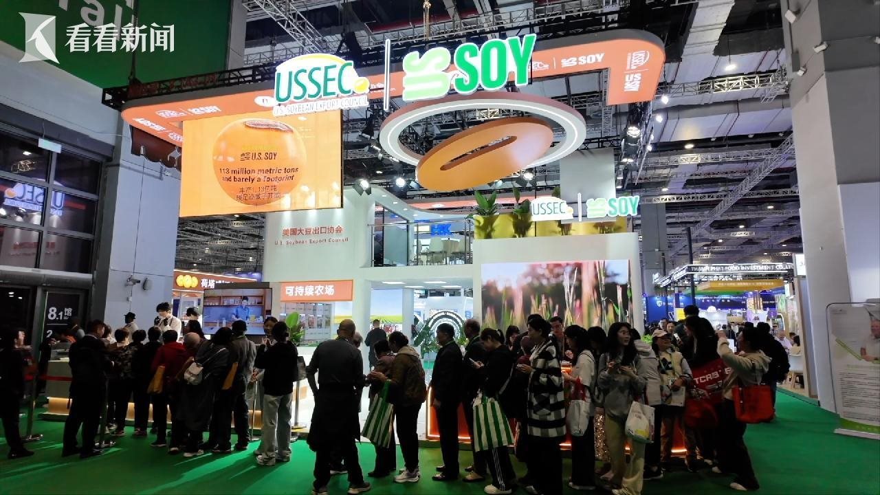蘇健說的不是客套話。進(jìn)博會(huì)一開始,他的行程就滿滿當(dāng)當(dāng)——開館剪彩、客商對接、媒體專訪。他的身后,是一群帶著中文名片、中文宣傳資料的豆農(nóng),賣力帶貨?!罢绱蠹以诂F(xiàn)場看到的,我們可以把大豆加工成大豆油,這種油品更適合高溫烹飪?!泵绹罐r(nóng)蓋思凱說。
