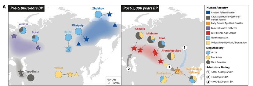 科研團隊這項研究首先發(fā)現(xiàn)中國五千年前存在獨特的家犬古老血統(tǒng),隨后數(shù)千年中國古代家犬逐漸出現(xiàn)來自西伯利亞和西方的古代家犬血統(tǒng)滲入,同時來自中國的古老東亞祖份也廣泛擴散到了歐亞草原多處。團隊通過與人類古基因組數(shù)據(jù)和證據(jù)對照,發(fā)現(xiàn)家犬數(shù)次滲入事件與人類的多次遷徙高度重合。如東西伯利亞早全新世家犬譜系與同時期人類譜系的分布高度吻合。此外,歐亞草原地區(qū)家犬中西方祖分的增加也與古人類遷移歷史相吻合,具體而言我們發(fā)現(xiàn)歐亞草原前期的新石器時代家犬和東歐狩獵采集人群相關,后期的青銅時代家犬和伊朗農(nóng)耕人群和高加索狩獵采集者相關。