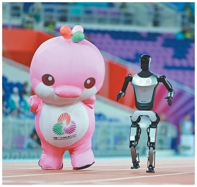 十五運(yùn)會賽場,吉祥物與機(jī)器人互動。本報記者 陶相安攝