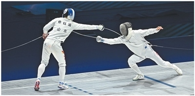 運(yùn)動員在十五運(yùn)會擊劍項目男子重劍個人決賽中。本報記者 王 亮攝