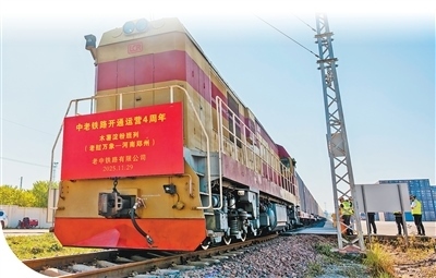 11月29日,一列滿(mǎn)載1000噸木薯淀粉的鐵路集裝箱班列從中老鐵路萬(wàn)象南站駛出,準(zhǔn)備發(fā)往河南鄭州。這是老撾首次成列運(yùn)輸輸華的木薯淀粉。凱 喬攝(新華社發(fā))