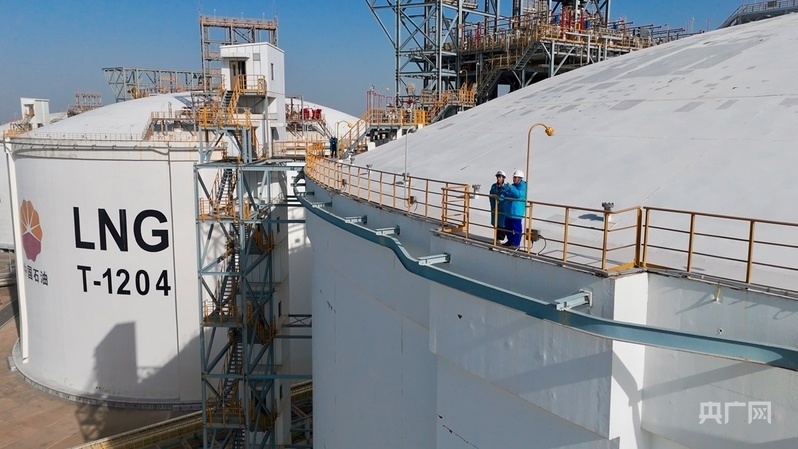 記者和采訪(fǎng)對(duì)象站在20萬(wàn)立方米的LNG儲(chǔ)罐上(央廣網(wǎng)記者 楊夢(mèng)奎 攝)