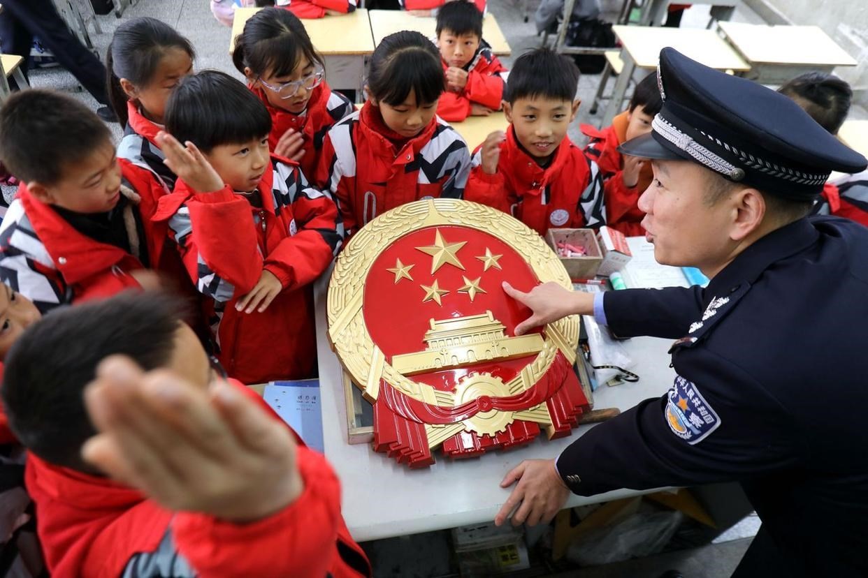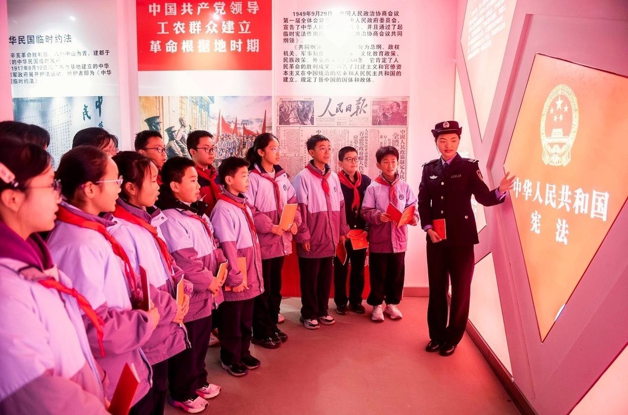 12月3日,安徽省馬鞍山市雨山區(qū)雨山實(shí)驗(yàn)學(xué)校,司法干警給學(xué)生解讀憲法核心內(nèi)容。(工人日報(bào)通訊員 歐宗濤 攝)