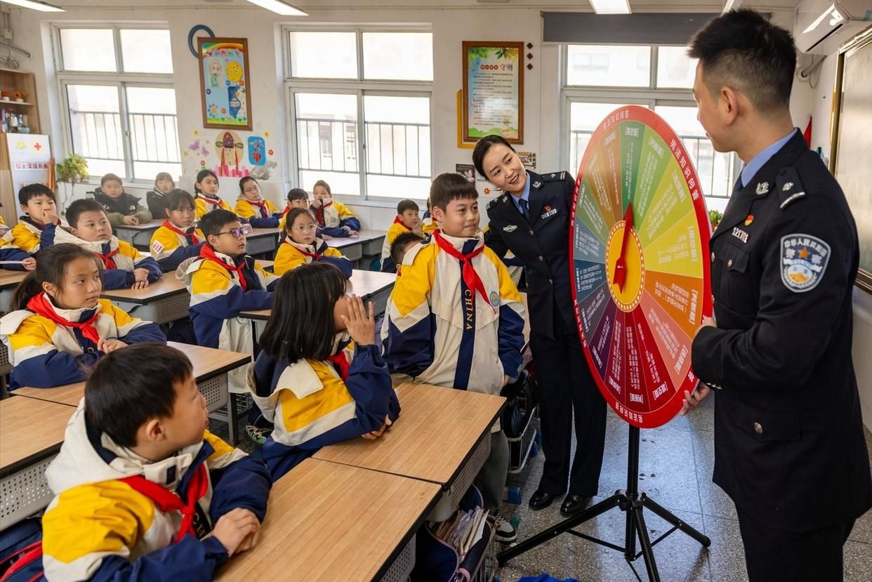 12月2日,安徽省舒城縣公安局網(wǎng)監(jiān)大隊(duì)聯(lián)合五顯派出所走進(jìn)五顯鎮(zhèn)中心學(xué)校課堂,為同學(xué)們帶來了一堂沉浸式、互動式的法治教育課。(工人日報(bào)通訊員 王可海 攝)