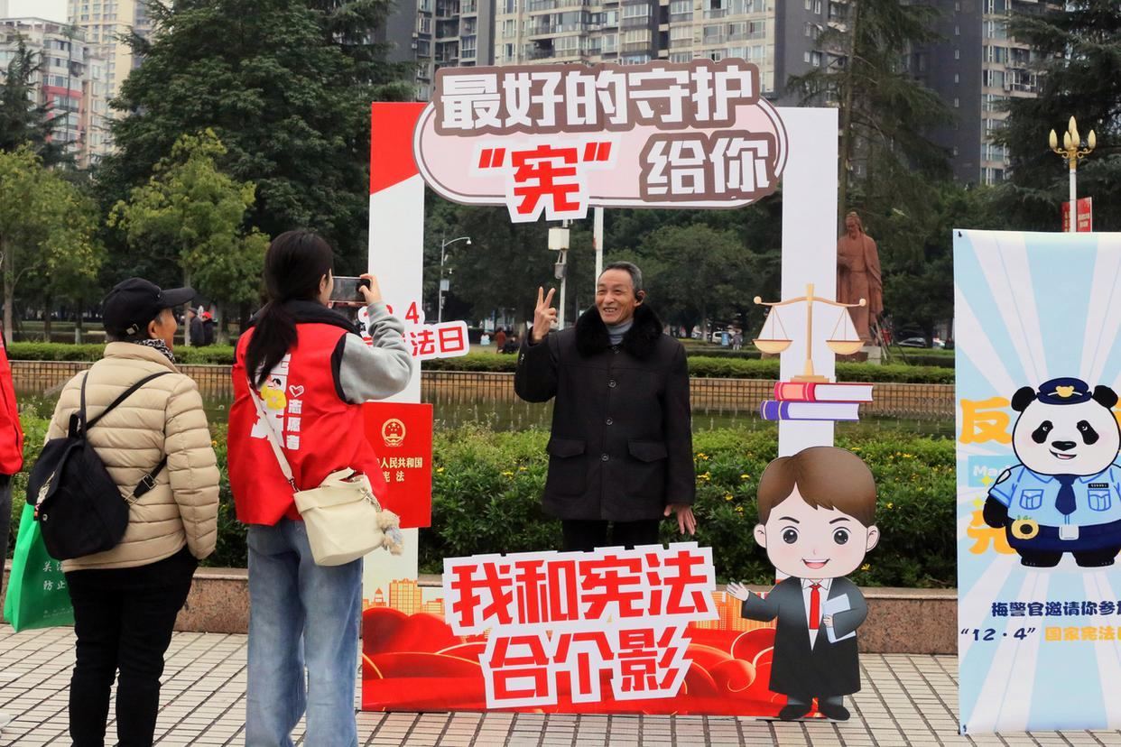 12月4日,四川省樂山市市中區(qū)司法局普法宣傳志愿者在樂山新廣場開展“憲法宣傳日”活動,市民在法治打卡框合影留念。(工人日報(bào)通訊員 李華時(shí) 攝)