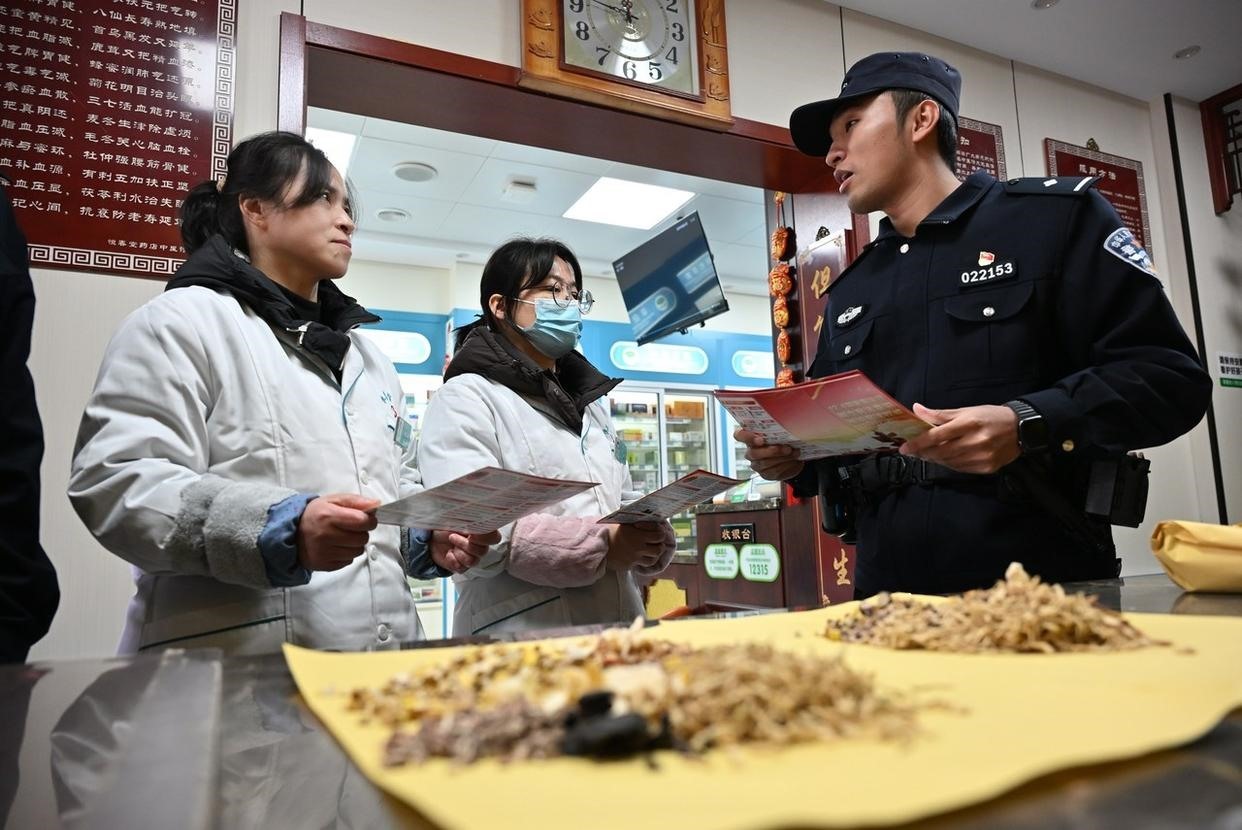 12月2日,安徽省馬鞍山市含山縣公安局林頭派出所聯(lián)合鎮(zhèn)司法所,將“法治課堂”搬進(jìn)菜市場門口,向過往群眾講解《中華人民共和國憲法》《中華人民共和國民法典》等法律法規(guī)。(工人日報(bào)通訊員 馮善軍 攝)
