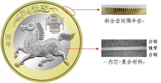 硬幣外環(huán)為黃銅合金,內(nèi)芯為具有獨特機讀性能的鎳帶復合白銅材料。防偽特征效果見圖1。