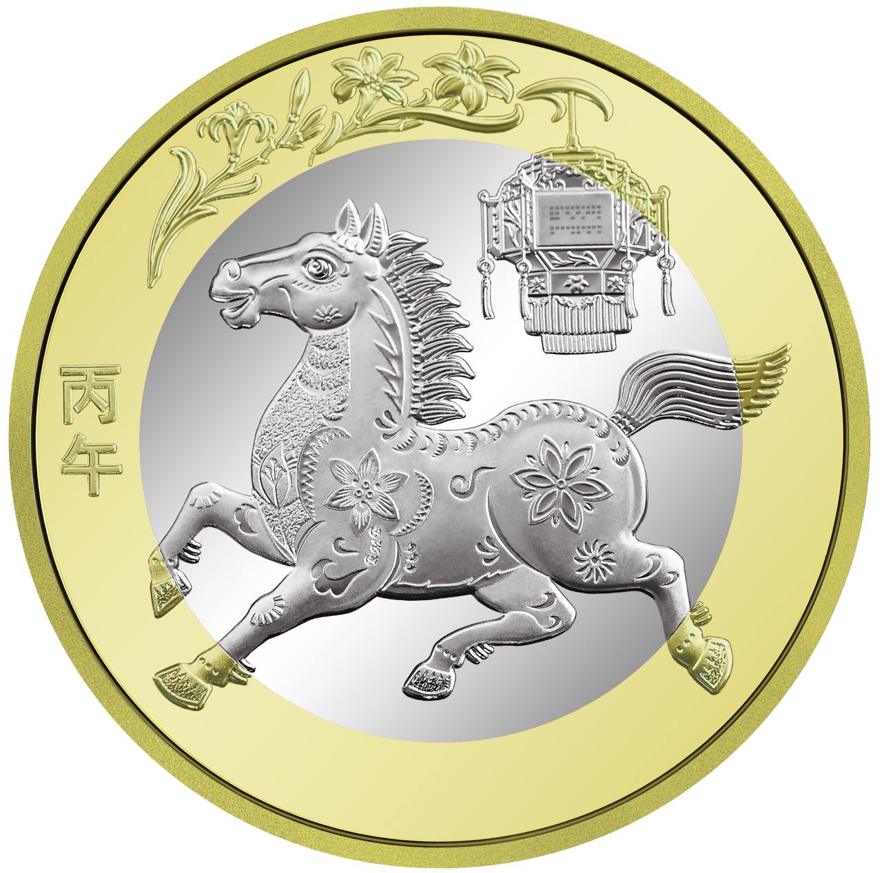 雙色銅合金紀念幣背面圖案為中國傳統(tǒng)剪紙藝術(shù)與裝飾年畫元素相結(jié)合的馬形象,襯以花燈和萱草圖案,幣面左側(cè)刊“丙午”字樣。
