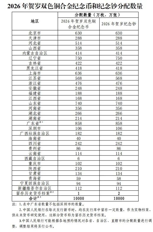 2026年1月12日前,中國人民銀行分支機構(gòu)將向社會公告當?shù)?026年賀歲雙色銅合金紀念幣和紀念鈔的分配數(shù)量等信息。承辦銀行將在其官方網(wǎng)站公布2026年賀歲雙色銅合金紀念幣和紀念鈔預約兌換網(wǎng)點及每個網(wǎng)點的可預約數(shù)量等信息。