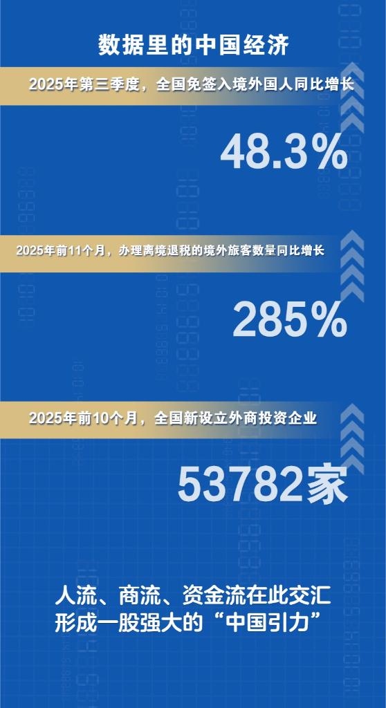 新華社上海12月26日電(記者王默玲、周蕊、桑彤)免簽政策持續(xù)擴容,“中國游”熱潮席卷全球;離境退稅便捷高效,“中國購”熱度持續(xù)攀升;外資企業(yè)加速布局,“投資中國”信心堅定。2025年,人流、商流、資金流在此交匯,形成一股強大的“中國引力”。