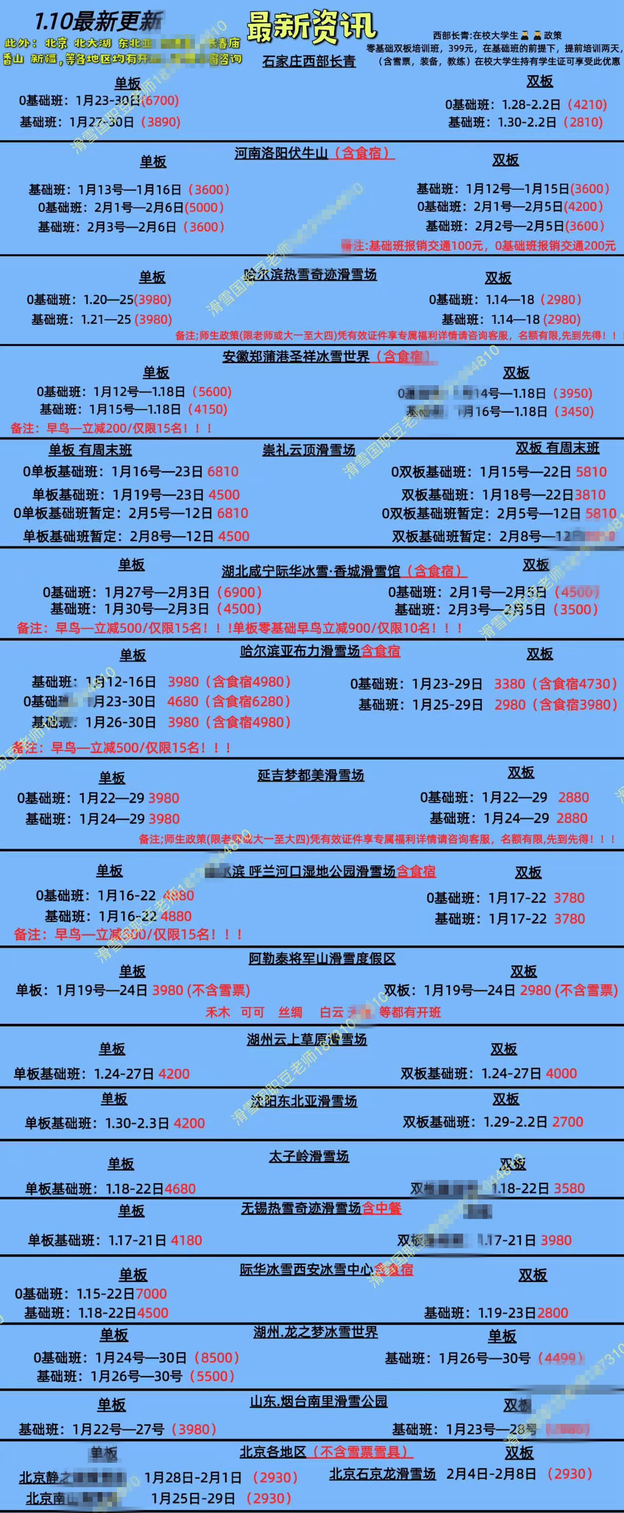 記者以“零基礎(chǔ)”滑雪者想要報考“滑雪國職五級”為由,咨詢了多家滑雪培訓機構(gòu)。一位培訓基地的豆先生展示了多個能提供培訓的雪場名單,涉及河北石家莊、河南洛陽、湖北咸寧、黑龍江哈爾濱等多地。當記者表示北京及周邊雪場更加方便時,豆先生隨即發(fā)來了包含培訓班日期、地點、價格等一系列報名細則的“國職教練證考試資訊”。