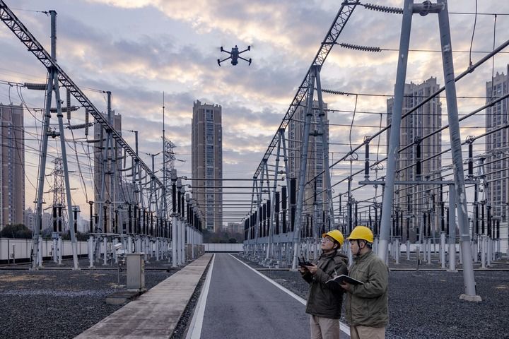 2月17日,國網(wǎng)泰州供電公司運維人員在220千伏寺巷變電站利用無人機巡檢電力設(shè)備。新華社發(fā)(湯德宏 攝)